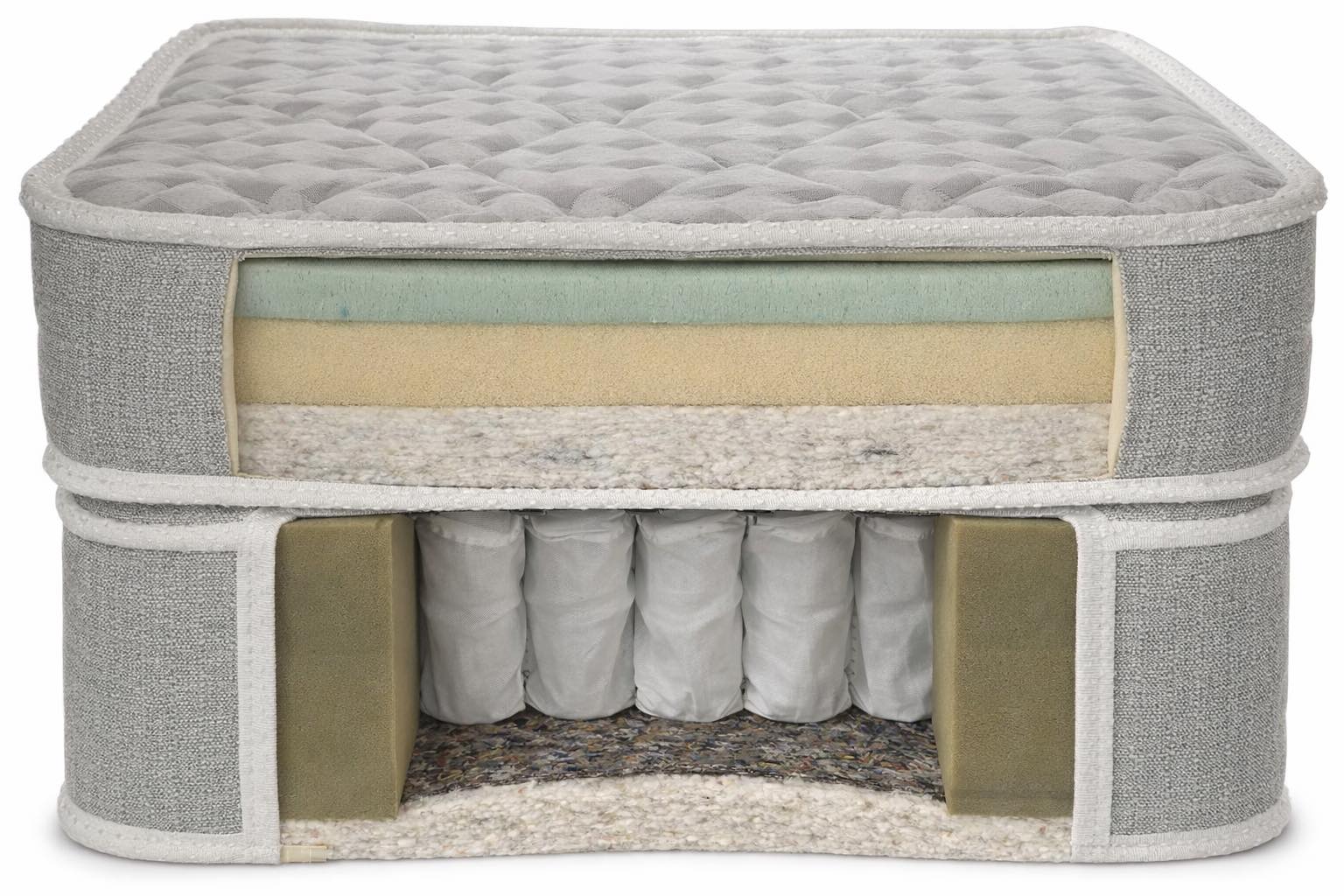 - ზედა მხარე შეიცავს ყველა კომფორტულ და ორთოპედიულ ფენას (მაგ. მემორი ქაფი, გელი, რბილი საფარი)